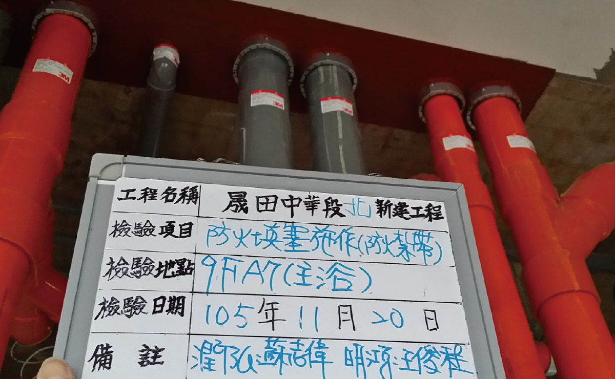設計時於管道間也規劃「垂直區劃防火」,不僅管路選用不燃材料製成,更以3M防火填縫泥確實封閉貫穿各層各戶的管道口縫隙,有效隔阻火談、有毒氣體、煙霧的穿透,維持建築物防火區劃完整性。當遇到高溫火焰悶燒時,此防火材會膨脹密實地封住破口,達到「阻火填塞」的效能,為使用者爭取更多安全的逃生時間。