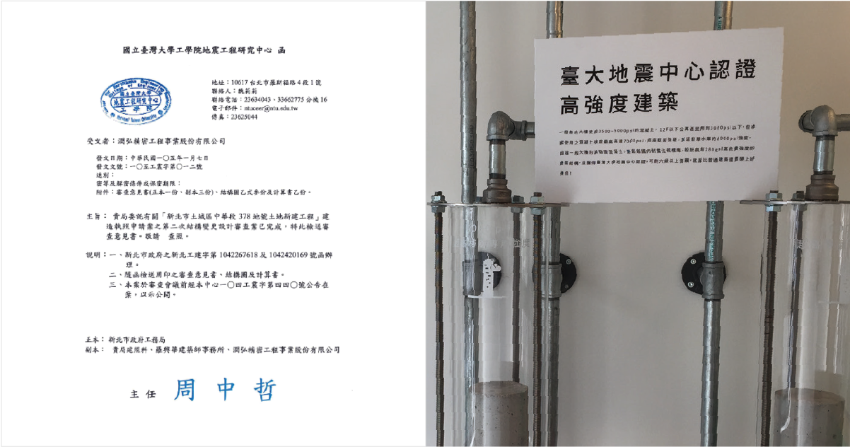 以優於國内耐震法規之結構設計,依建築規模結構設計審查,即公正核可之第三方公開認證,耐震設計值經計算可耐地表最大加速度達300gal以上,等於台灣地震中心的分級6級(地動加速度範圍 250~400gal)。