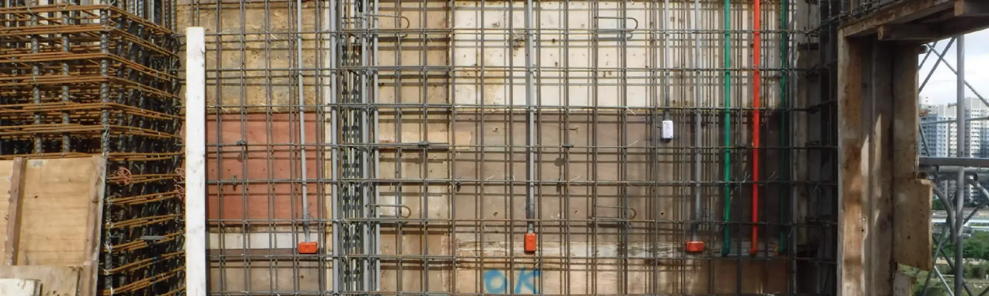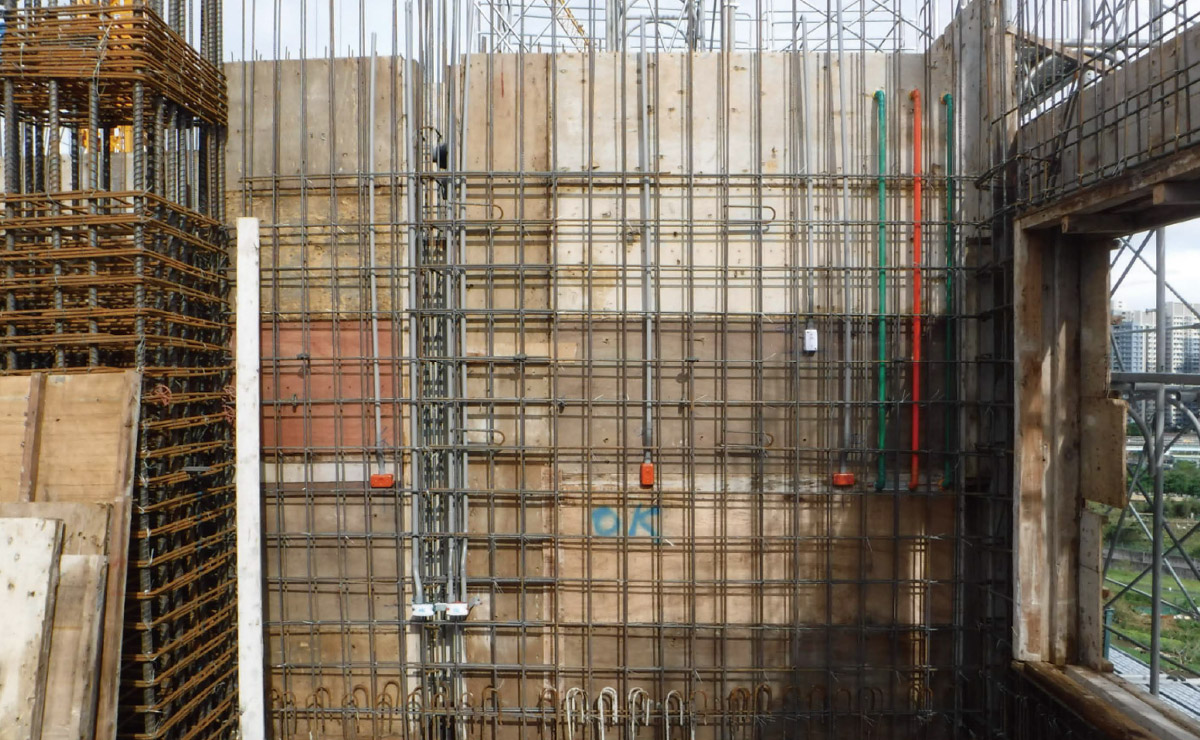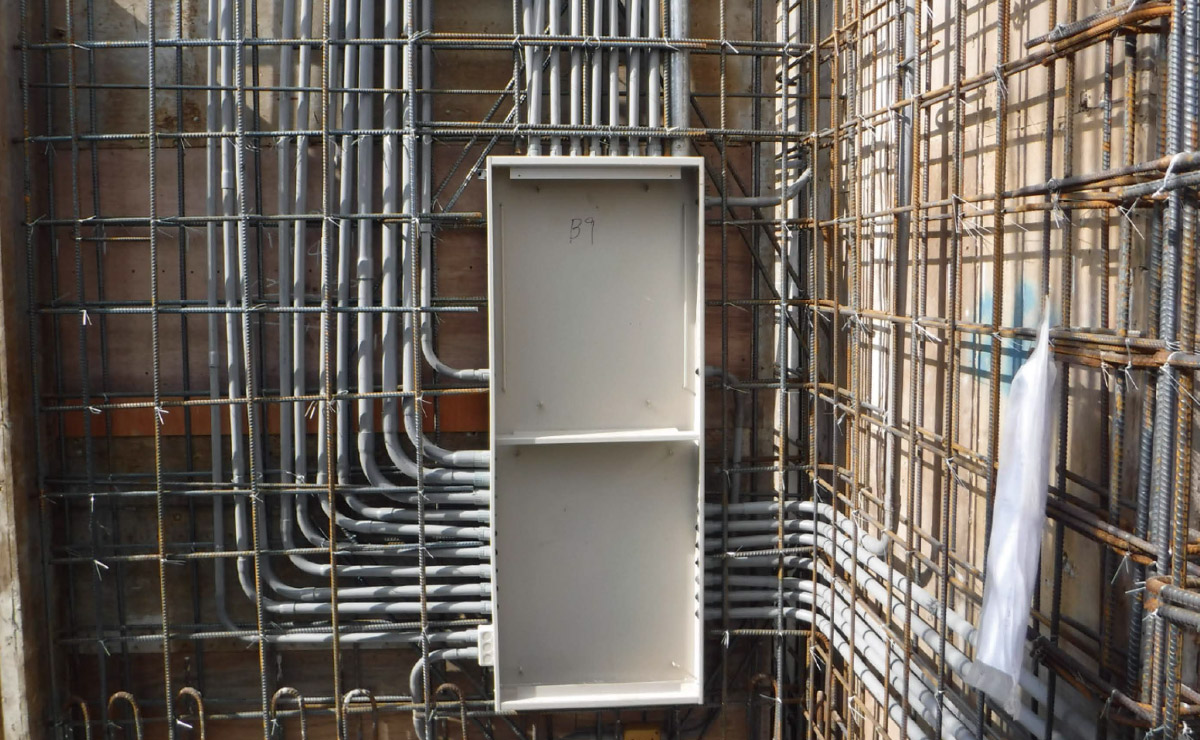 灰色管線為電管,於垂直牆面組立工程中即與結構體—同施作,進行上配管。
