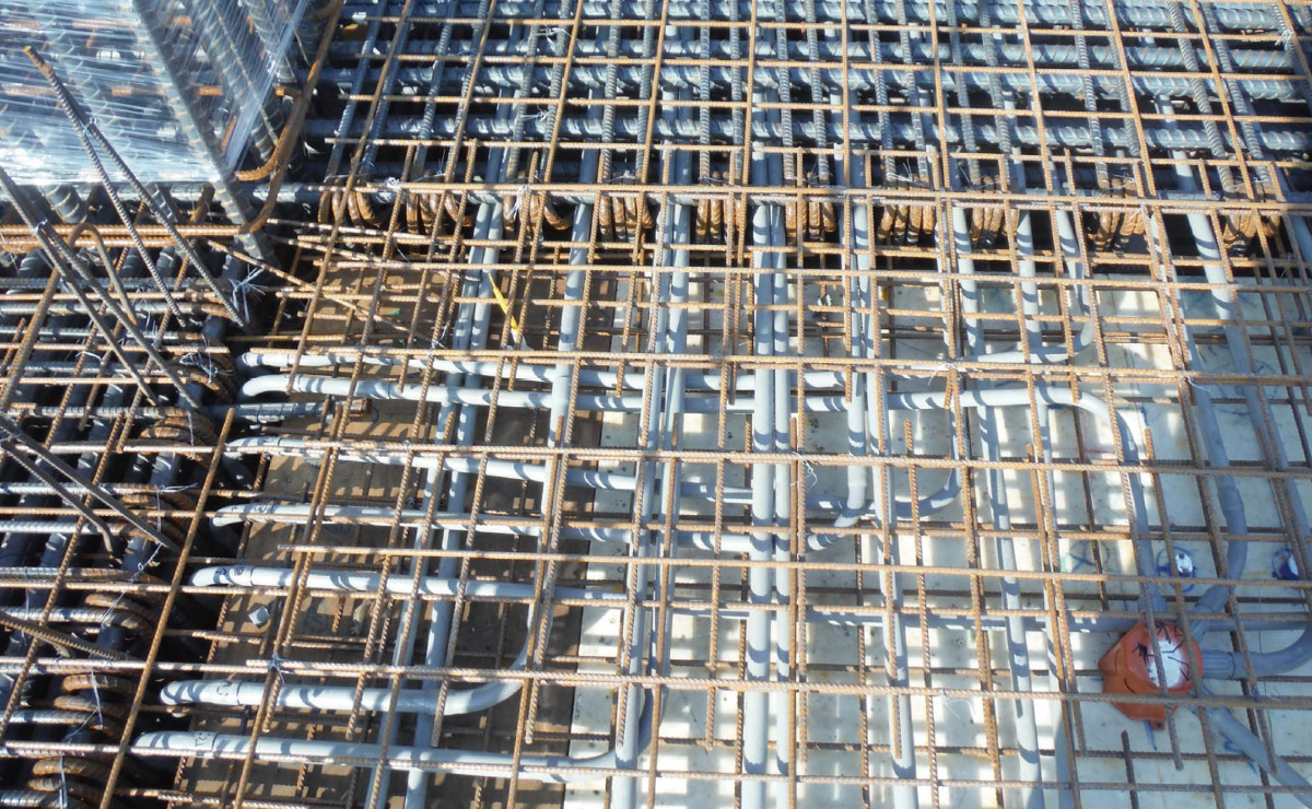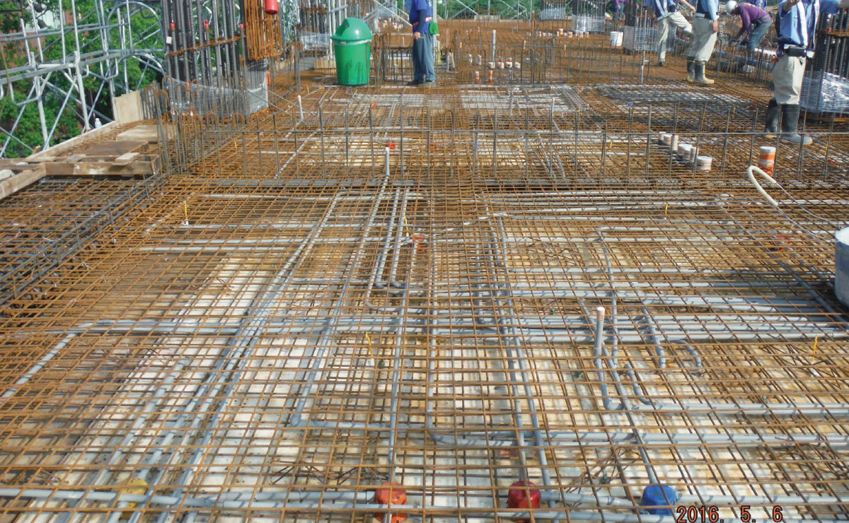 樓版鋼筋綁紮採用熔接鋼線網,鋼網具有規格化的間距,施工重點易掌握,在灌漿過程中不會因施工踩踏而移位鬆脫,因此保護層厚度可精確控制,相較傳統更能提高品質、防止龜裂。
