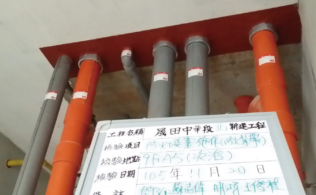 設計時於管道間也規劃「垂直區劃防火」,不僅管路選用不燃材料製成,更以3M防火填縫泥確實封閉貫穿各層各戶的管道口縫隙,有效隔阻火談、有毒氣體、煙霧的穿透,維持建築物防火區劃完整性。當遇到高溫火焰悶燒時,此防火材會膨脹密實地封住破口,達到「阻火填塞」的效能,為使用者爭取更多安全的逃生時間。